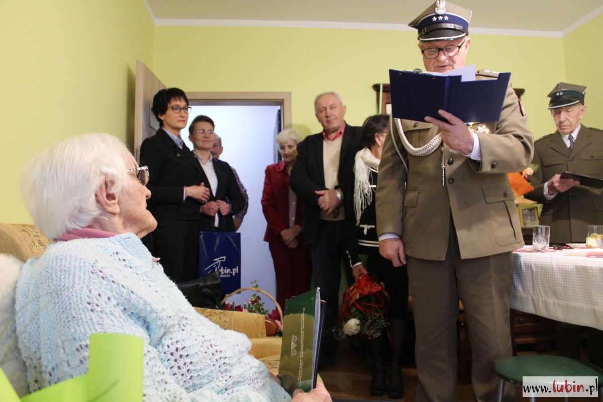 Oprócz życzeń długich lat w zdrowiu, otrzymała drobne upominki i mnóstwo kwiatów, między innymi od wicestarosty powiatu lubińskiego Władysława Siwaka, przedstawicielki prezydenta Lubina Marzeny Reutt oraz kombatantów i lubińskich harcerzy. Lubiński Związek Weteranów i Rezerwy Wojska Polskiego wręczył jubilatce za jej przeszłość wojenną i działalność kombatancką Medal 25-lecia Związku Weteranów i Rezerwy Wojska Polskiego na Dolnym Śląsku. Otrzymała ona też awans na stopień chorążego Związku Strzeleckiego.
