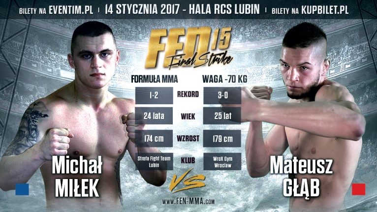 Michał Miłek i Mateusz Głąb po raz pierwszy w klatkoringu Fight Exclusive Night spotkali się podczas majowej gali FEN 12 Feel The Force we wrocławskiej Hali Stulecia. Przy głośnym dopingu miejscowych kibiców po niezwykle zaciętej walce decyzją sędziów wygrał reprezentant WroX Gym Wrocław. Na FEN 15 Final Strike przed własną publicznością walczyć będzie jednak zawodnik Streffa Fight Team Lubin, więc przy tak wyrównanym poziomie obu fighterów mocne wsparcie z trybun tym razem jego może ponieść do zwycięstwa.