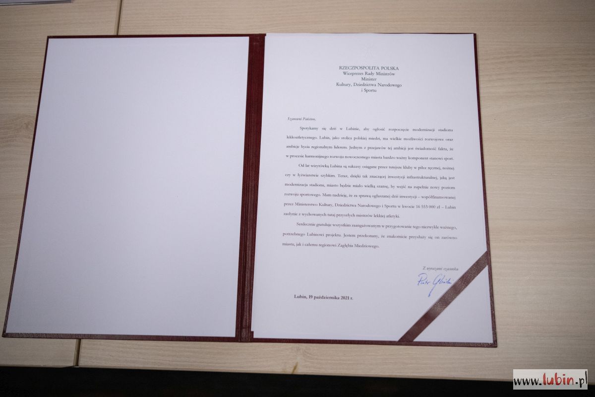 Dziś w Lubinie prezydent odebrał symboliczny czek z deklaracją wsparcia sportowej inwestycji pieniędzmi z budżetu Ministerstwa Kultury, Dziedzictwa Narodowego i Sportu.