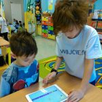 – Zabawę z programowaniem rozpoczęliśmy od programu SCRATCH JUNIOR – mówi pomysłodawczyni akcji Karolina Tokarek, wychowawca klasy Iia. – Przedszkolakom bardzo spodobała się ta aplikacja i jej niesamowite możliwości. Wspaniale bawiliśmy się na macie Mistrzów Kodowania, gdzie pokazaliśmy kilka zabaw matematycznych dr Mirosława Dąbrowskiego. Nasi uczniowie pokazali młodszym kolegom i koleżankom, jak można mądrze wykorzystać tablety do nauki. Największym zainteresowaniem cieszyły się roboty Dash i Dot, które wprowadzają w świat programowania poprzez zabawę. Uczniowie naszej klasy z ogromnym przejęciem opiekowali się przedszkolakami, wspierali, tłumaczyli, naprowadzali. W jednej sali ponad 40 dzieci, jednak nie było mowy o hałasie. Na zakończenie na dzieci czekała słodka niespodzianka: mistrzowski tort Dota. Dzieci były zachwycone. Przedszkolakom żal było wracać do przedszkola i wierzymy, że szkoła będzie kojarzyć im się z miejscem, gdzie dzieją się fascynujące rzeczy, a nauka bywa czystą przyjemnością – relacjonuje wychowawca.