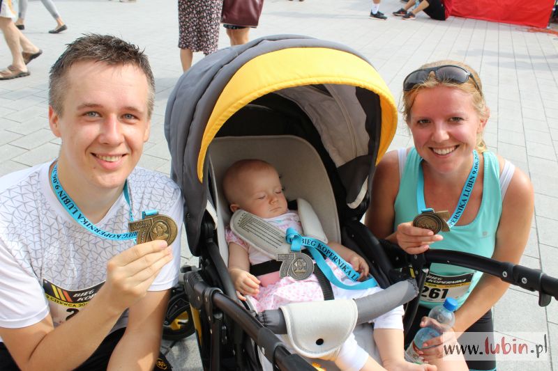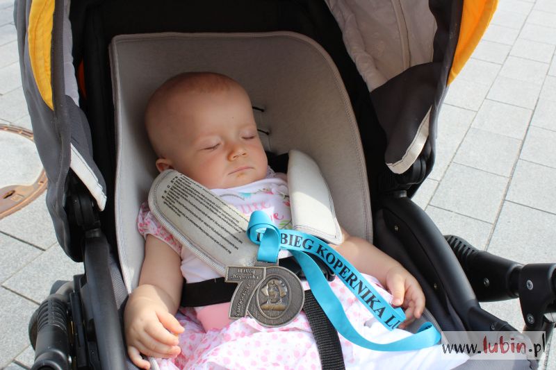 Ośmiomiesięczna Alicja na metę przybyła bez śladu zadyszki. Mimo, że dziewczynka cały bieg spędziła w wózku i przespała, otrzymała pamiątkowy medal. – Ala lubi spać na dworze – uśmiechają się rodzice Agata i Piotr. Lubinianie z pochodzenia, którzy obecnie mieszkają pod Wrocławiem, na bieg przyjechali przy okazji odwiedzin rodziców.
