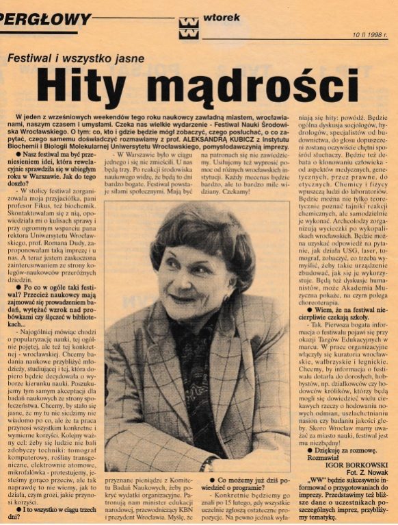 Pierwszy Festiwal Nauki we Wrocławiu odbył się w 1998 r. Poniżej znajdziecie tekst autorstwa Igora Borkowskiego (ówcześnie dziennikarza i doktoranta UWr, a obecnie profesora belwederskiego, naukowca związanego z SWPS), który ukazał się 10 lutego 1998 r. w Wieczorze Wrocławia.