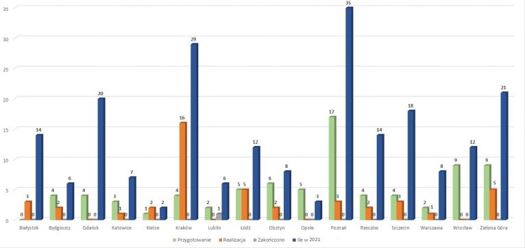 Dla 45 inwestycji zostały już podpisane umowy na roboty. Dla kolejnych 22 inwestycji trwają procedury przetargowe na wyłonienie wykonawcy robót. Zakładamy, że w III kwartale br. zostanie ogłoszona duża liczba przetargów na kolejne inwestycje realizowane w ramach PBID.