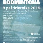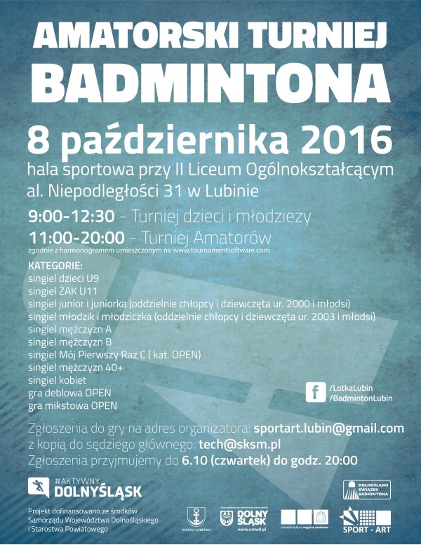Amatorski Turniej Badmintona odbędzie się w sobotę, 8 października w hali sportowej przy II Liceum Ogólnokształcącym w Lubinie, al. Niepodległości 31. Uczestnicy powinni mieć własne rakietki, ale będą mieli zapewniony prowiant i poczęstunek.