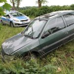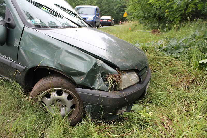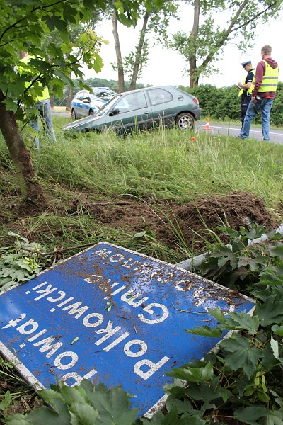 Do wypadku doszło na granicy powiatów polkowickiego i lubińskiego. Auto zmiotło znak drogowy pierwszego z powiatów i zatrzymało się na terenie tego drugiego.