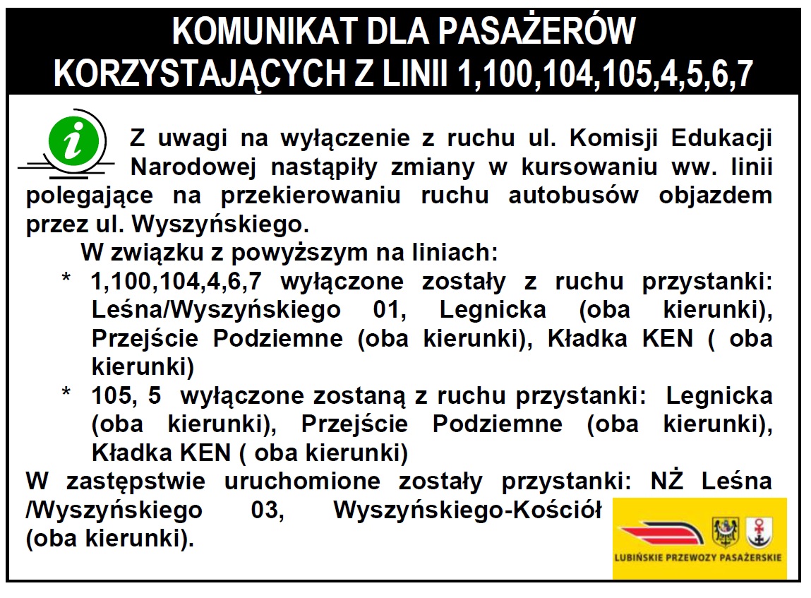 W związku z zamknięciem ulicy Komisji Edukacji Narodowej, autobusy Lubińskich Przewozów Pasażerskich kursują zmienionymi trasami. Wyłączone z ruchu zostały m.in. przystanki przejście podziemne i kładka KEN. Kursy odbywają się objazdem ulicą Wyszyńskiego.