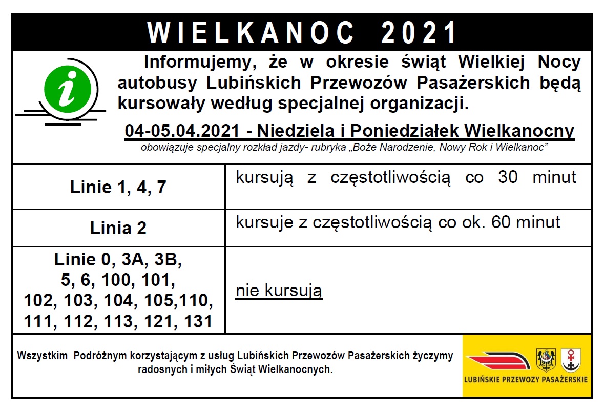W święta żółte autobusy będą kursować według specjalnego rozkładu jazdy. Jeśli ktoś chce skorzystać z Lubińskich Przewozów Pasażerskich w Wielkanoc lub wielkanocny poniedziałek, powinien wcześniej zapoznać się z rozkładem.