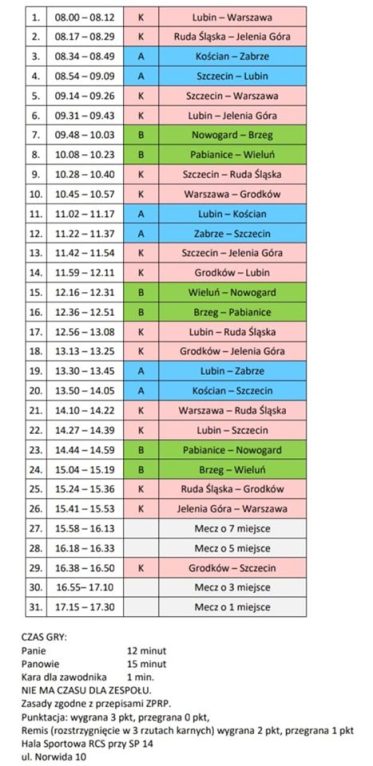 Mecze rozgrywane będą po 12 minut (panie) i 15 minut (panowie). Turniej w hali SP 14 rozpocznie się o godzinie 8:00, mecz o trzecie miejsce rozpocznie się o godzinie 16:55, a o godzinie 17:15 odbędzie się wielki finał.