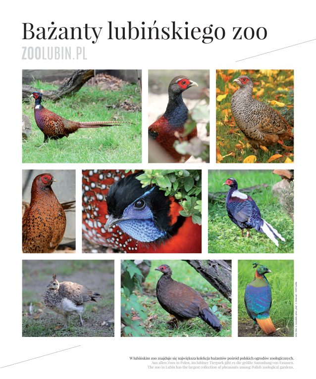 Na wystawie można zobaczyć zdjęcia 20 gatunków bażantów, które żyją w lubińskim ogrodzie zoologicznym. Są one wzbogacone opisem. Lubińskie zoo ma największą kolekcję bażantów pośród polskich ogrodów zoologicznych.