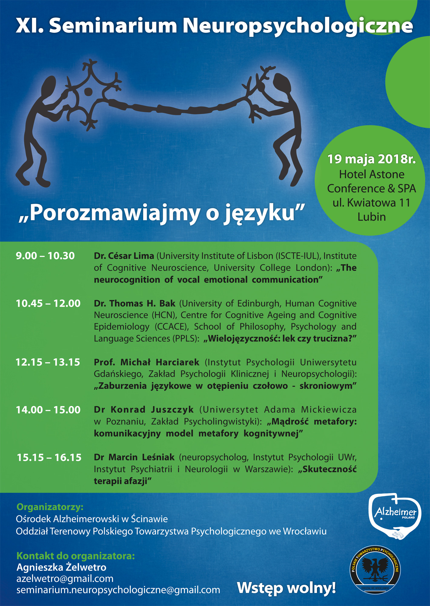 – godz. 15.15– 16.15 doktora Marcina Leśniaka (neuropsycholog, Instytut Psychologii UWr, Instytut Psychiatrii i Neurologii w Warszawie): „Skuteczność terapii afazji”.