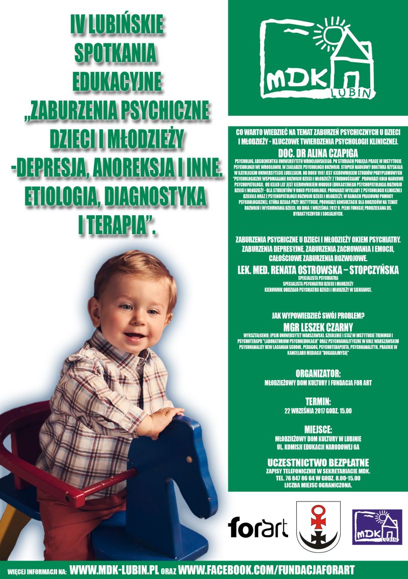 Jakie choroby psychiczne najczęściej dotykają najmłodszych? Które okoliczności, sytuacje lub wydarzenia mogą sprzyjać ich powstawaniu? Czym się objawiają choroby psychiczne i w jaki sposób się je leczy? Na te i inne pytania będzie można uzyskać odpowiedzi podczas IV Lubińskich Spotkań Edukacyjnych.