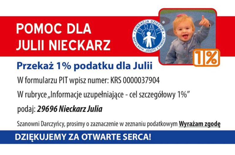 Aby przekazać Julci 1 procent swojego podatku w formularzu PIT należy wpisać nr: KRS 0000037904, a w rubryce „Informacje uzupełniające – cel szczegółowy 1 %” należy podać: 29696 Nieckarz Julia. Trzeba też pamiętać, by zaznaczyć w zeznaniu podatkowym „Wyrażam zgodę”.