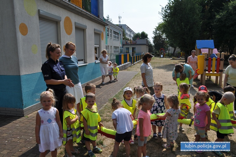 Z myślą o najmłodszych mieszkańcach naszego miasta lubińscy policjanci, odwiedzili dzieci w Żłobku Miejskim w Lubinie. Wszystko w ramach działań „Kręci mnie bezpieczeństwo nad wodą” oraz „Bezpieczne wakacje”. Głównym celem spotkania było przypomnienie dzieciom podstawowych zasad bezpieczeństwa podczas letniego wypoczynku. Mundurowi przekazali informacje, jak należy reagować w sytuacjach zagrożenia i do kogo zwrócić się o pomoc. Opowiedzieli też o swojej pracy, a na koniec przekazali maluszkom kamizelki odblaskowe i węża spacerowego, by dzieci były widoczne i bezpieczne.