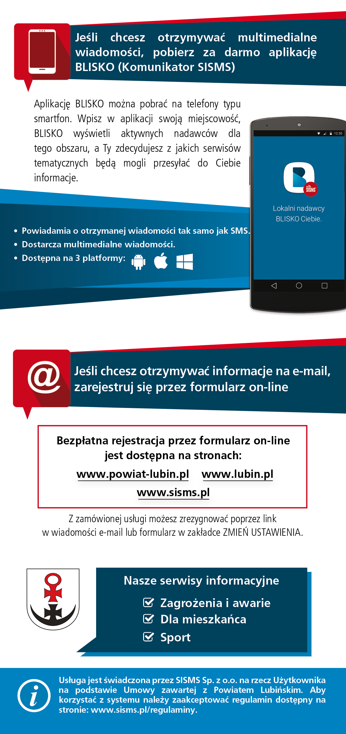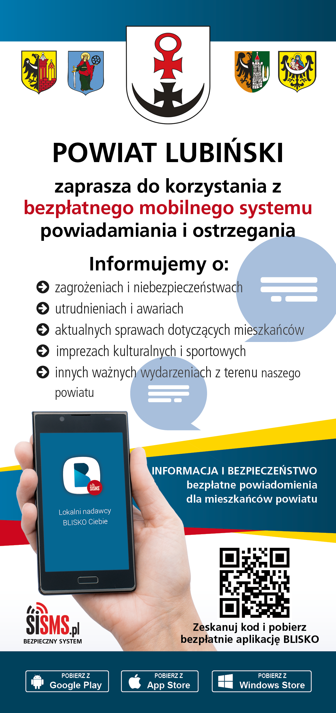 Informacje z powiatu lubińskiego dotyczące zagrożeń i awarii, utrudnień, komunikacji powiatowej, imprez kulturalnych i sportowych czy innych ważnych dla mieszkańców wydarzeń dostępne są już w bezpłatnej aplikacji BLISKO, którą można pobrać na telefon typu smartfon i otrzymywać powiadomienia w ramach wybranej kategorii tematycznej.