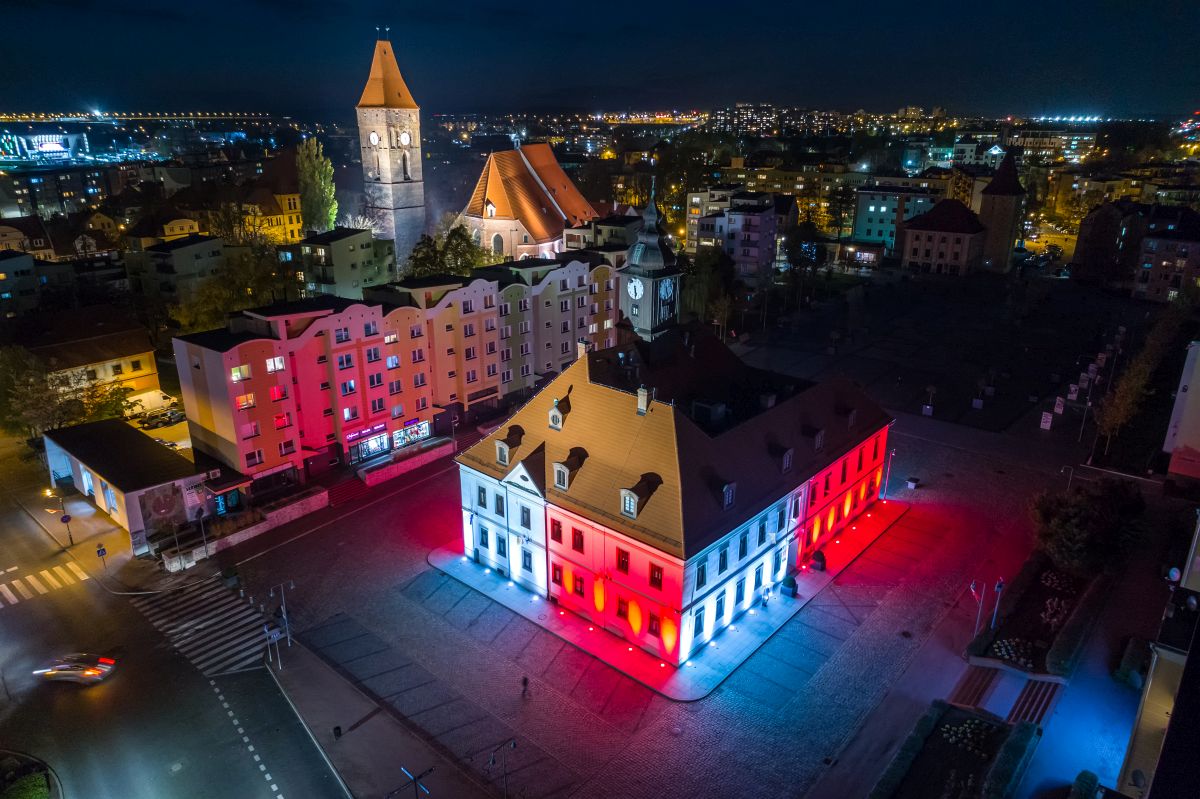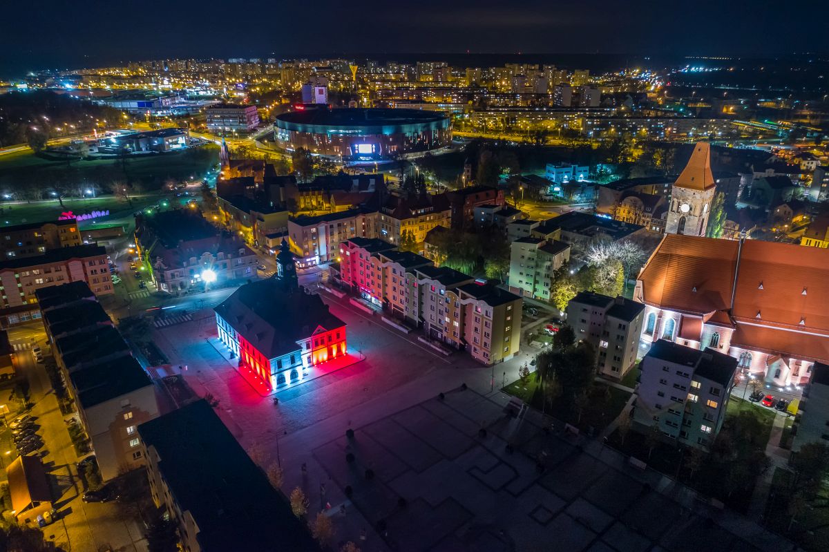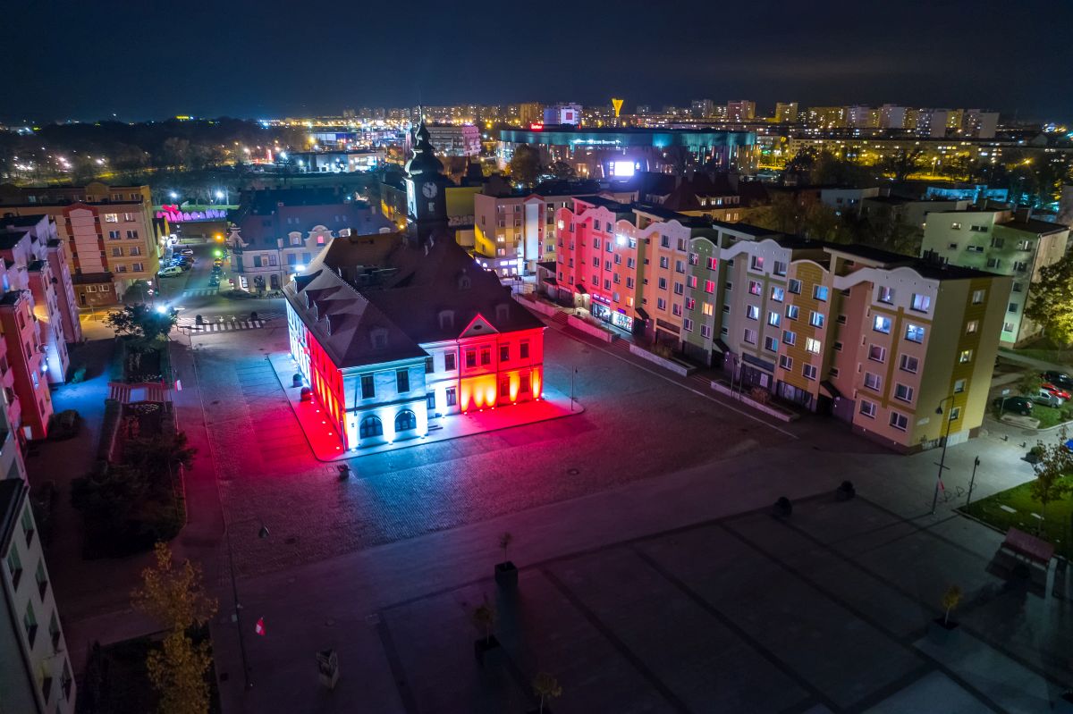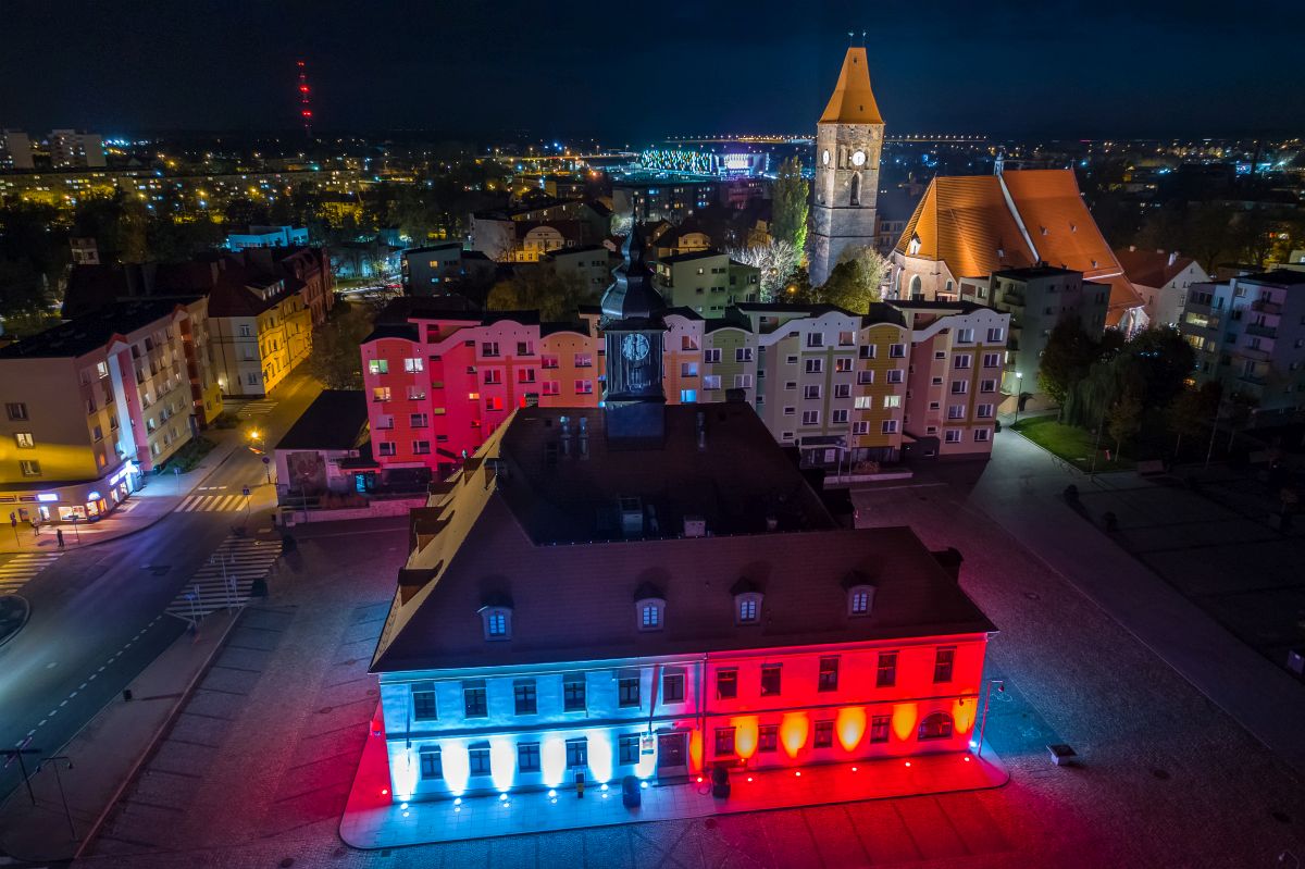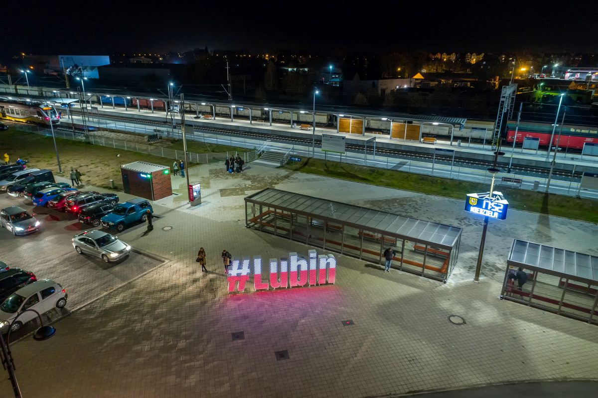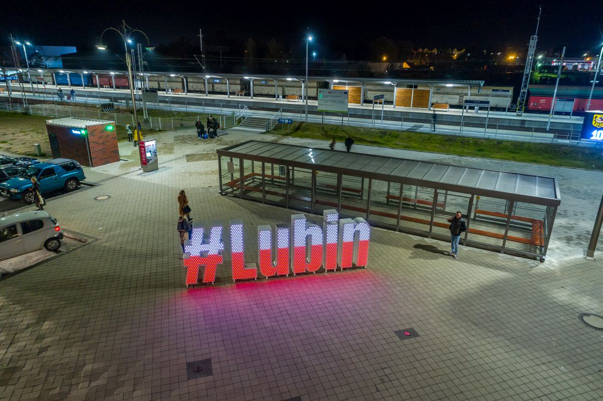 Litery na stacji kolejowej świecą w barwach narodowych już od kilku nocy, dziś dołączył do nich lubiński ratusz.