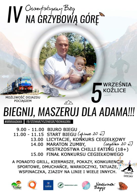 Będzie można przyjemnie spędzić czas, ale przede wszystkim komuś pomóc. Mieszkańcy Koźlic już po raz czwarty organizują Charytatywny Bieg na Grzybową Górę. Tym razem chcą wesprzeć leczenie Adama Mikosia z Lubina, który walczy ze złośliwym nowotworem. Wszystkich, którzy chcieliby dołożyć swoją cegiełkę, zapraszają do Koźlic już w najbliższą sobotę, 5 września.