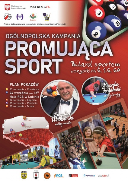Uczniowski Klub Sportowy Baribal Lubin wspólnie z Regionalnym Centrum Sportowym zapraszają dzieci i dorosłych w dniu 24 września 2019r. o godz. 12.00 do Hali Widowiskowo – Sportowej. Po raz pierwszy odbędzie się tam pokaz umiejętności sportowej gry w bilard w ramach Ogólnopolskiej Kampanii promującej bilard „BILARD SPORTEM WSZYSTKICH 6,16,60”.