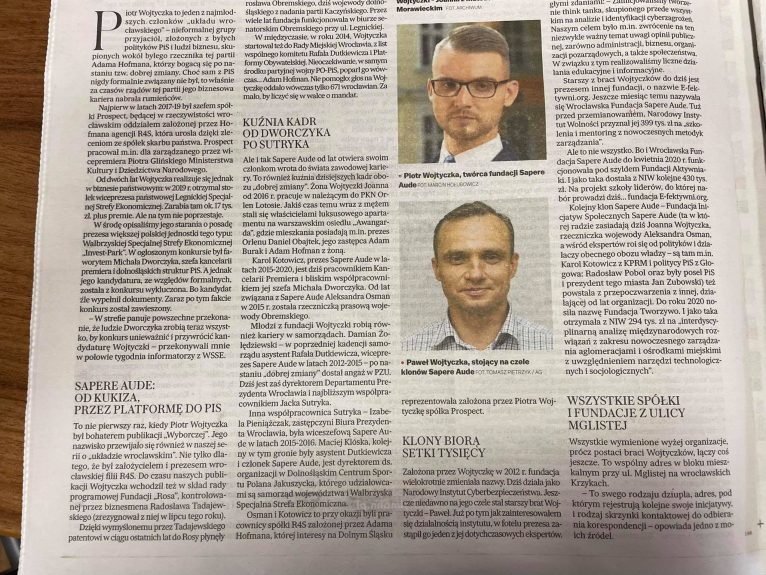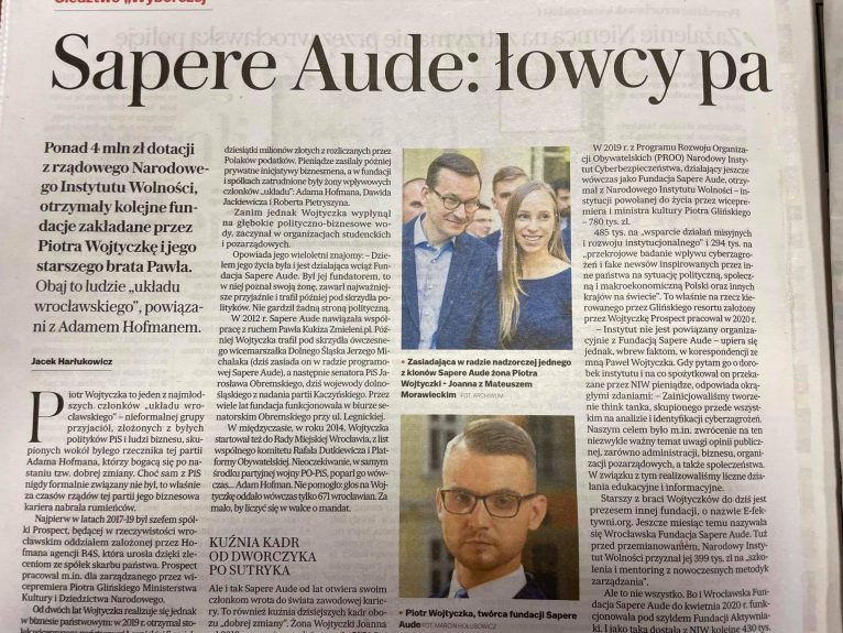 Wszystko miało się zacząć od Fundacji Sapere Aude, której Wojtyczka był założycielem i dzięki której zawarł najważniejsze przyjaźnie i polityczne znajomości. W 2012 r. fundacja nawiązała współpracę z ruchem Pawła Kukiza Zmieleni.pl, a w kolejnych latach jej fundator trafił pod skrzydła prominentnych polityków. Od kilku lat Sapere Aude regularnie otrzymuje środki z państwowych dotacji. Jak wyliczył dziennikarz GW Jacek Harłukowicz w sumie uzbierało się ponad 4 mln zł. Co ciekawe, fundacja wielokrotnie zmieniała nazwy, co szczegółowo opisała GW. Obecnie działa jako Narodowy Instytut Cyberbezpieczeństwa, na czele którego do niedawna stał starszy z braci Wojtyczków – Paweł. Autor sugeruje, że ciągłe przepoczwarzenia fundacji Sapere Aude to sposób na ukrycie faktu, że te same podmioty po kilka razy pobierają dotacje z tego samego rządowego źródła. Zapytany o to Paweł Wojtyczka miał stanowczo zaprzeczyć.