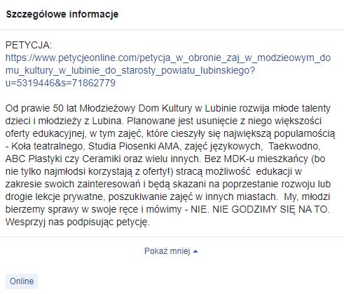 W mediach społecznościowych pojawiły się głosy mieszkańców i samych pracowników MDK protestujących przeciwko likwidacji placówki i podkreślających sukcesy jej wychowanków. Na Facebooku powstała grupa „Ratujmy MDK w Lubinie!”, gdzie znajduje się m.in. link do petycji w sprawie dalszej działalności ośrodka. Apel do starosty lubińskiego podpisało do tej pory 258 osób.