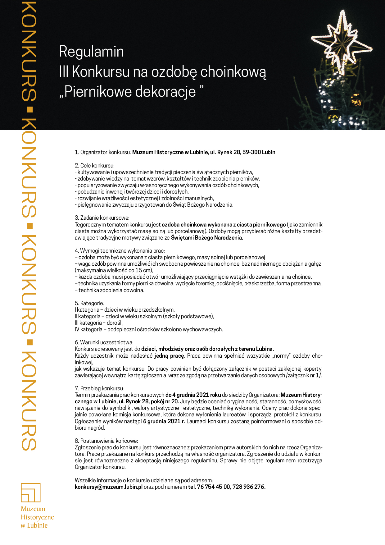 Choć do Bożego Narodzenia zostało jeszcze trochę czasu, Muzeum już teraz zachęca, by wczuć się w atmosferę świąt. Do 4 grudnia czeka na ozdoby choinkowe wykonane przez mieszkańców Lubina. Prace należy dostarczyć do siedziby Muzeum Historycznego w Lubinie, ul. Rynek 28, pokój nr 20.