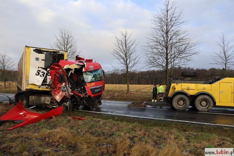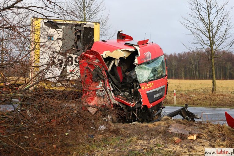 Od wczoraj warunki panujące na drogach są bardzo trudne, o czym przekonało się już kilku kierowców. Wieczorne opady spowodowały gołoledź – ulice i chodniki pokryte są warstwą lodu. Dziś, wczesnym rankiem, w poślizg wpadła ciężarówka popularnej sieci handlowej. Pojazd uderzył w przydrożne drzewo i całkowicie zablokował drogę wojewódzką nr 335 łączącą Lubin z Chocianowem.
