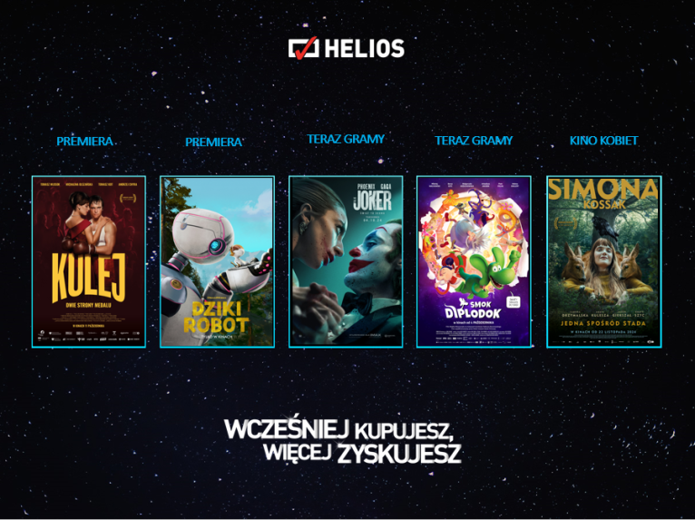 Bilety na jesienne seanse dostępne są w kasach kin Helios, w aplikacji mobilnej oraz na stronie www.helios.pl. Dokonując zakupu wcześniej, można wybrać najlepsze miejsca, a także zaoszczędzić w ramach unikalnej oferty „Wcześniej kupujesz, więcej zyskujesz”.