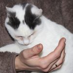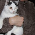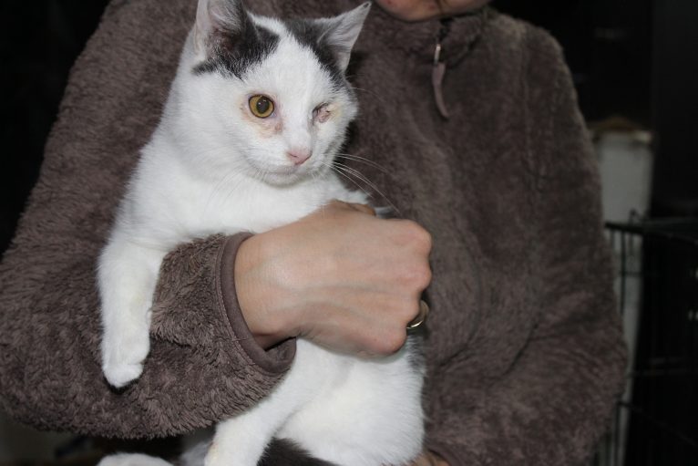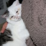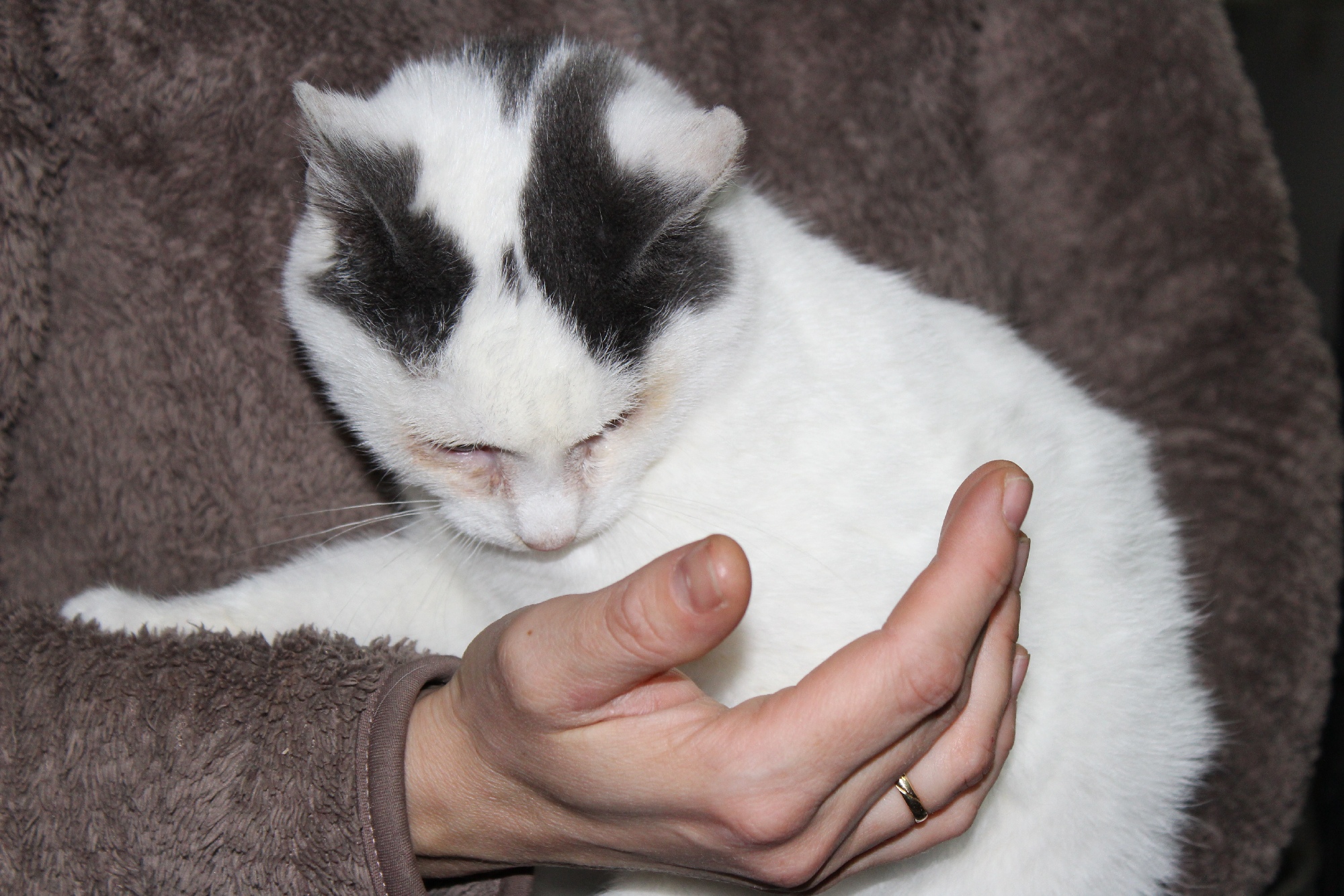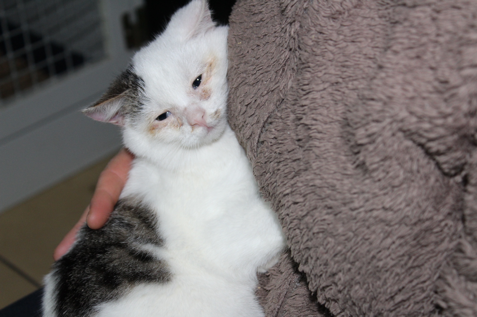 Biało-niebieski Plamek nie ma jeszcze pół roku, dopiero gubi mleczne zęby. Jest bardzo przytulaśny i w niczym nie przeszkadza mu brak jednego oczka, którego niestety nie dało się uratować.