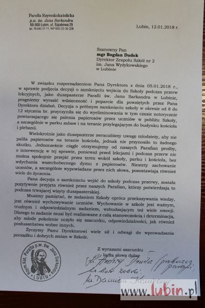 Z takiego obrotu spraw zadowolona była nie tylko dyrekcja, ale też pobliski kościół i okoliczni mieszkańcy. Parafia św. Jana Sarkandra w Lubinie wystosowała do dyrektora szkoły oficjalne pismo z podziękowaniami. Zdaniem duszpasterzy, decyzja dyrektora wyeliminowała problem palenia papierosów pod kościołem. Ucichły też wulgaryzmy.