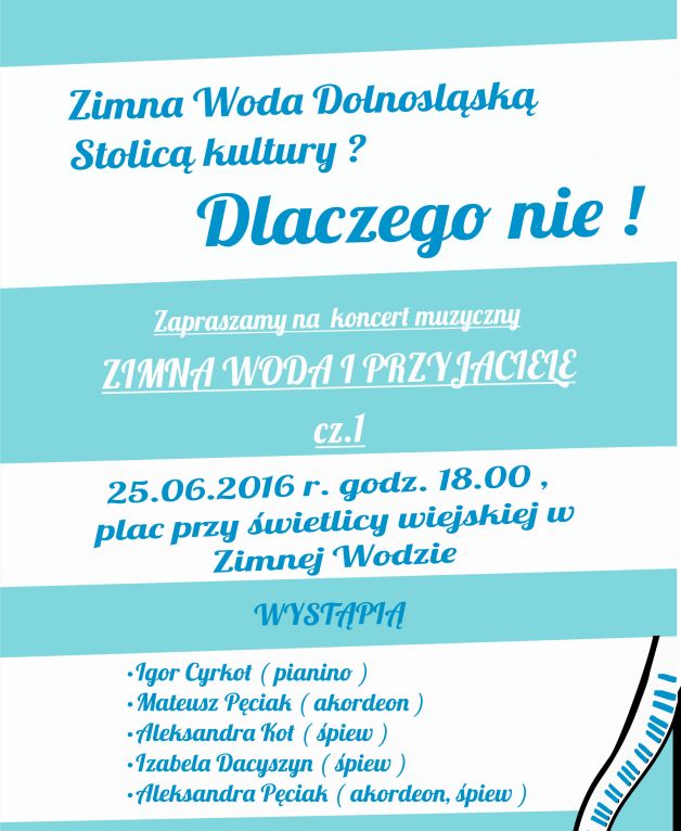 „Zimna Woda Dolnośląską Stolicą Kultury? Dlaczego nie?” – pod takim hasłem, w najbliższą sobotę, odbędzie się koncert przygotowany dla mieszkańców miejscowości. Zagrają zarówno miejscowe zespoły, jak i zaproszeni goście. W ten sposób organizatorka, Zuzanna Pęciak, chce uhonorować wszystkich mieszkańców Zimnej Wody, którzy zasłużyli się na rzecz swojej społeczności.