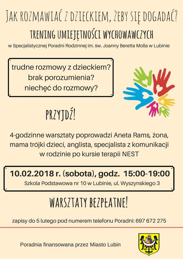 Straciłeś kontakt ze swoim dzieckiem? Nie wiesz jak do niego dotrzeć? – Specjalistyczna Poradnia Rodzinna im. św. Joanny Beretta Molla w Lubinie zaprasza rodziców na bezpłatne warsztaty pt. „Jak rozmawiać z dzieckiem, żeby się dogadać – trening umiejętności wychowawczych”.
