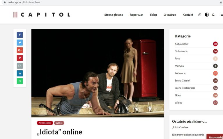 W internecie można obejrzeć kolejny klasyczny spektakl Teatru Muzycznego Capitol we Wrocławiu. Tym razem jest to „Idiota” w reżyserii Wojciecha Kościelniaka. Przedstawienie można oglądać do wznowienia zwykłej działalności teatru, na oficjalnej stronie Capitolu.