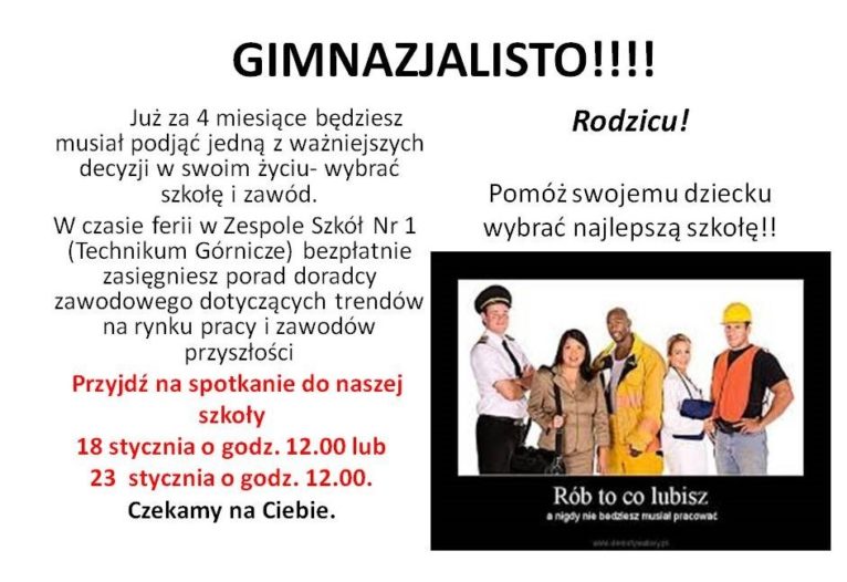 Wybrałeś już szkołę średnią? A może wciąż się wahasz? – specjalnie dla gimnazjalistów w Zespole Szkół nr 1 odbędzie się spotkanie z doradcą zawodowym. – Przyjdź, a dowiesz się jaką skończyć szkołę, by znaleźć pracę na polskim i europejski rynku pracy – zachęca Bożena Pahuta, doradca zawodowy.