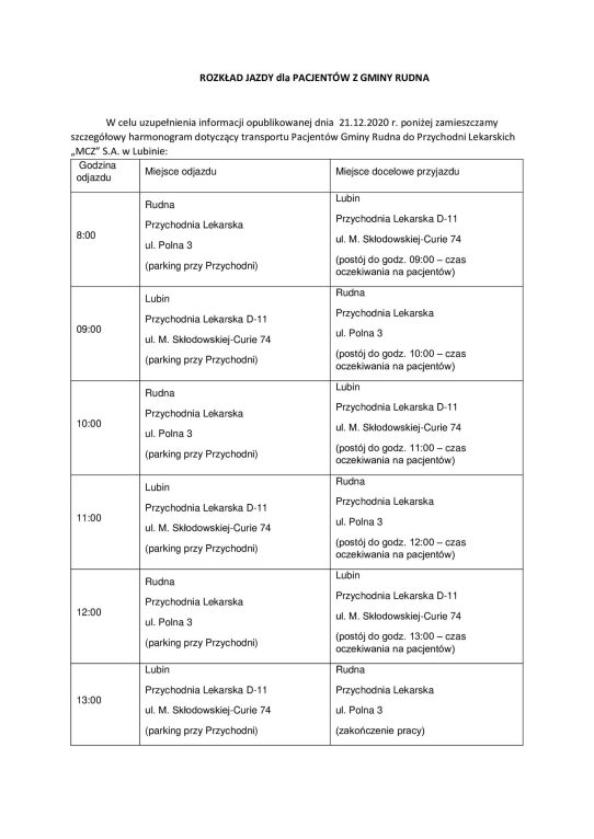 Jak już informowaliśmy na naszym portalu, Miedziowe Centrum Zdrowia w Lubinie z końcem 2020 roku przestało świadczyć usługi medyczne na terenie gminy Rudna. Spółka podziękowała mieszkańcom za wieloletnią i udaną współpracę, informując jednocześnie, że jej dotychczasowi pacjenci nadal mogą korzystać z opieki zdrowotnej MCZ-u, tyle, że w Lubinie. By ułatwić mieszkańcom gminy Rudna dotarcie do przychodni w stolicy polskiej miedzi w styczniu został dla nich uruchomiony bezpłatny transport.