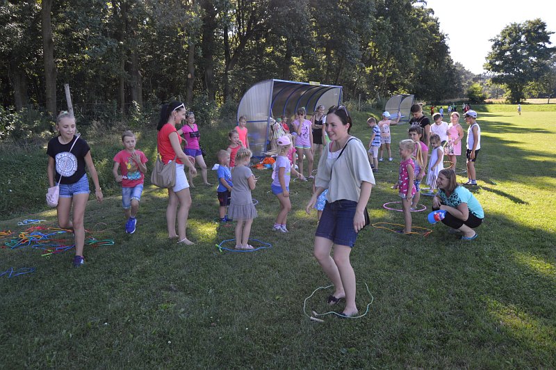 Najmłodsi natomiast z instruktorami z Chobieńskiego Ośrodka Kultury bawili się w kółko i krzyżyk, w kolory, przeciągnie liny i pokonywali różne tory przeszkód. Zjawił się również lisek, który łapał gąski. Było też pieczenie kiełbasek przy ogromnym ognisku, o które zadbała Grażyna Siwek.