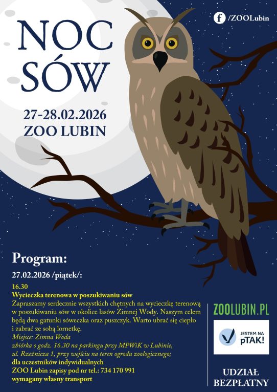 – Ogród Zoologiczny w Lubinie zaprasza do wzięcia udziału w piętnastym już ogólnopolskim wydarzeniu Noc Sów, którego pomysłodawcą i organizatorem jest stowarzyszenie „Jestem na pTAK!”. Zapraszamy na wycieczkę terenową w pobliskie lasy w celu znalezienia sóweczki oraz puszczyka, a także prelekcję na temat polskich gatunków sów połączoną ze wspólnym spacerem po naszym zoo – mówi Agata Bończak, dyrektor Ogrodu Zoologicznego w Lubinie.
