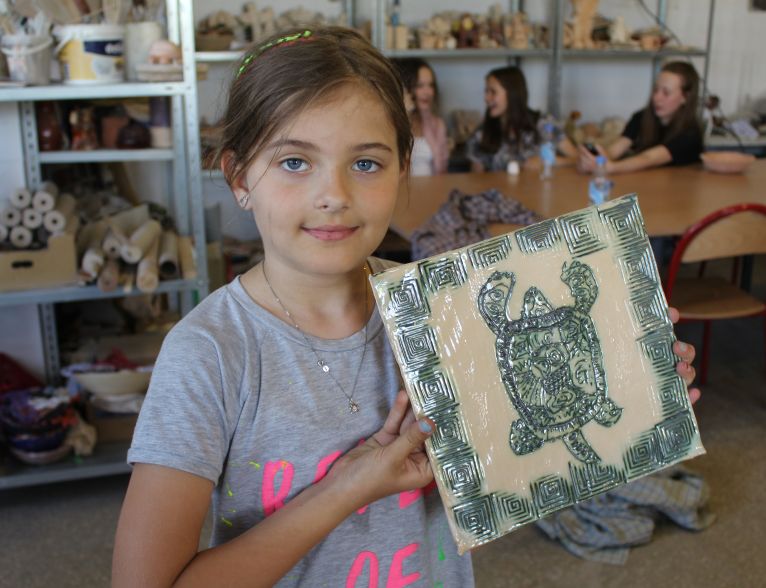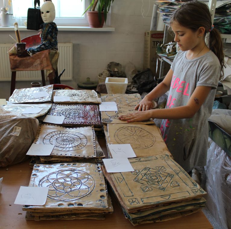 – Praca w glinie nie jest taka trudna, po prostu trzeba się przyzwyczaić. Na warsztaty ceramiczne chodzę od dwóch lat. Wzięłam udział w projekcie „Ściana” i zrobiłam trzy lub cztery płytki. Na jednej z nich jest wazon z kwiatkami i wzorki. Wykonanie jednej płytki zajęło mi półtorej godziny, czyli całe zajęcia – opowiada dziewięcioletnia Natalia.