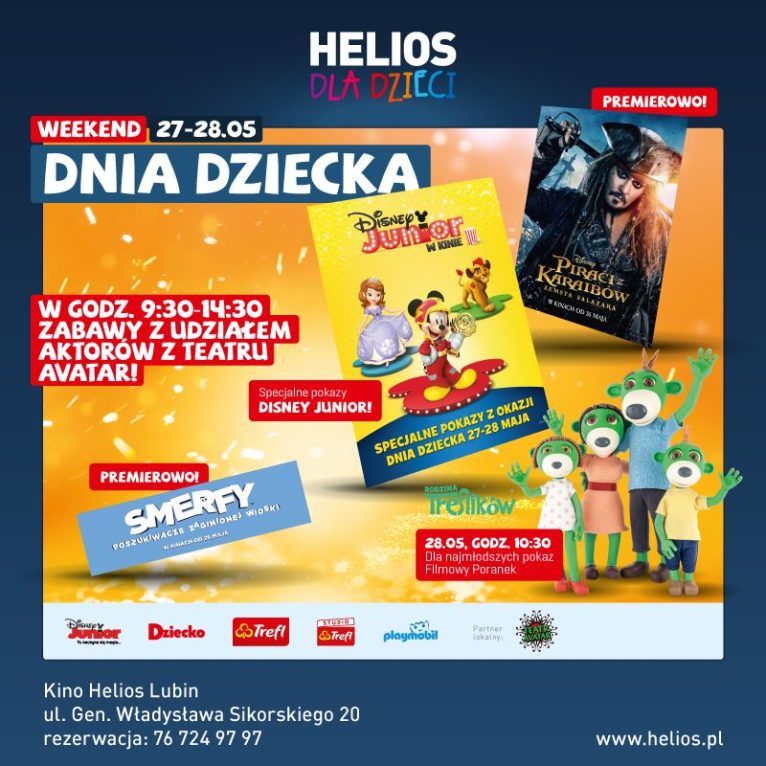 Lubińskie kino Helios będzie świętować Dzień Dziecka nieco wcześniej, bo już w najbliższy weekend, 27 i 28 maja. Będą specjalne pokazy filmowe, ale i mnóstwo atrakcji dla najmłodszych. Dla naszych Czytelników mieliśmy bilety na sobotnie i niedzielne pokazy Disney Junior, seanse filmów „Smerfy” i „Piraci z Karaibów” oraz na specjalne wydanie Filmowych Poranków z rodziną Treflików.