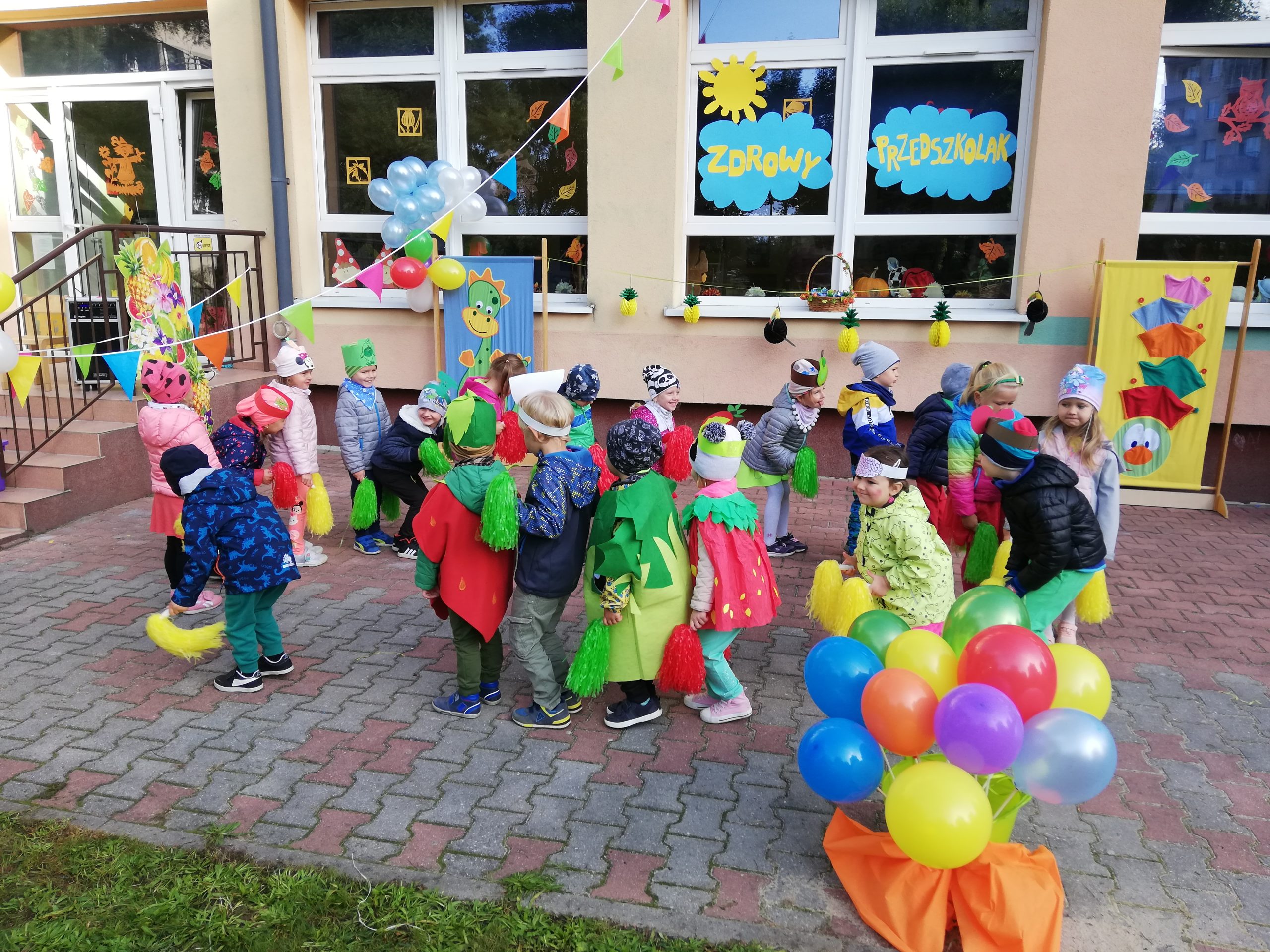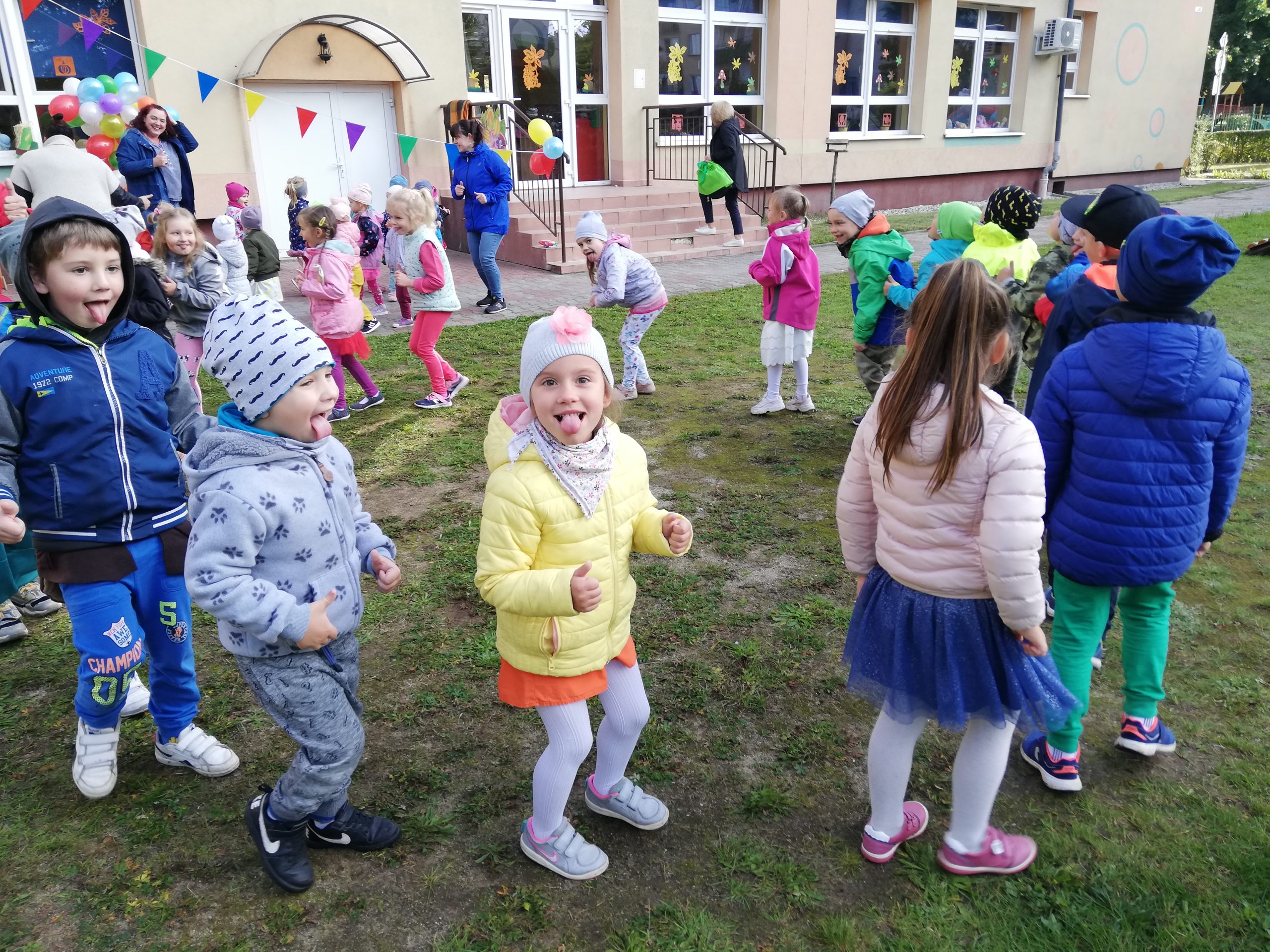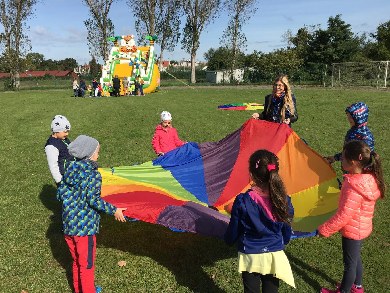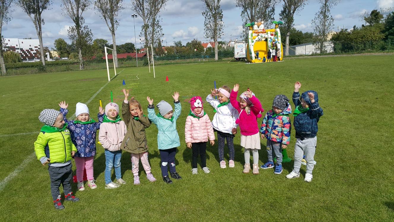 Impreza plenerowa odbyła się na boisku przy Młodzieżowym Domu Kultury w Lubinie, gdzie maluchy dojechały autobusami miejskimi, a starszaki przywędrowały pieszo. Zabawę rozpoczęło uroczyste powitanie przez panią dyrektor i wspólne tańce w kole. Następnie dzieci wzięły udział w zawodach sportowych i bawiły się z użyciem chust animacyjnych.
