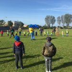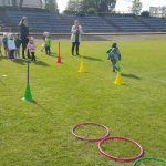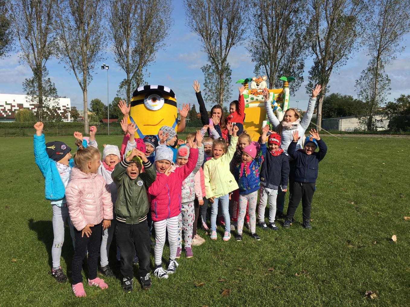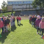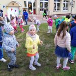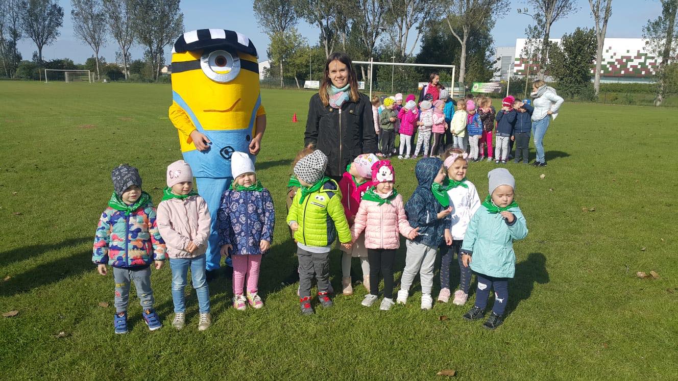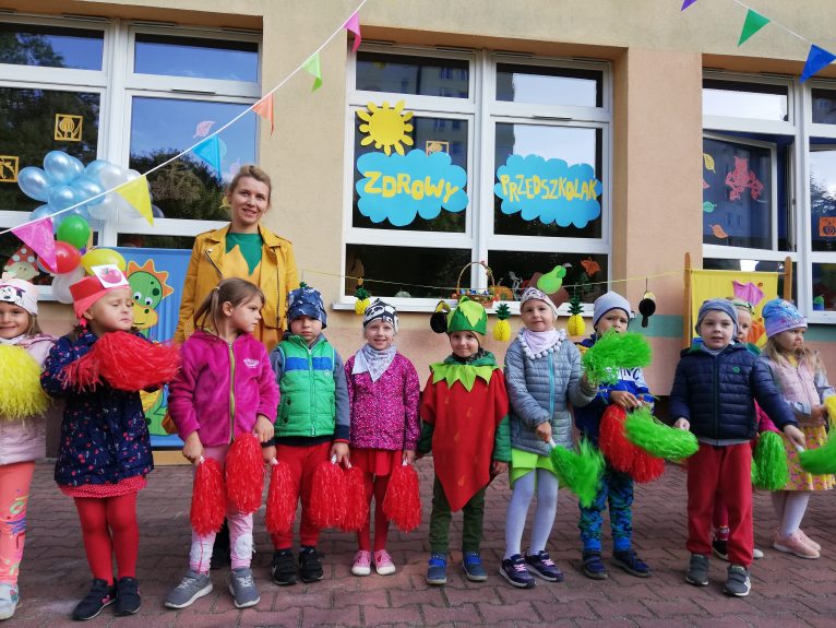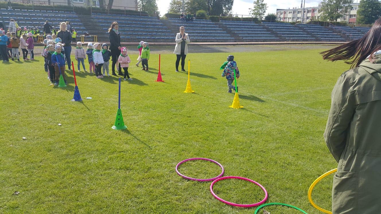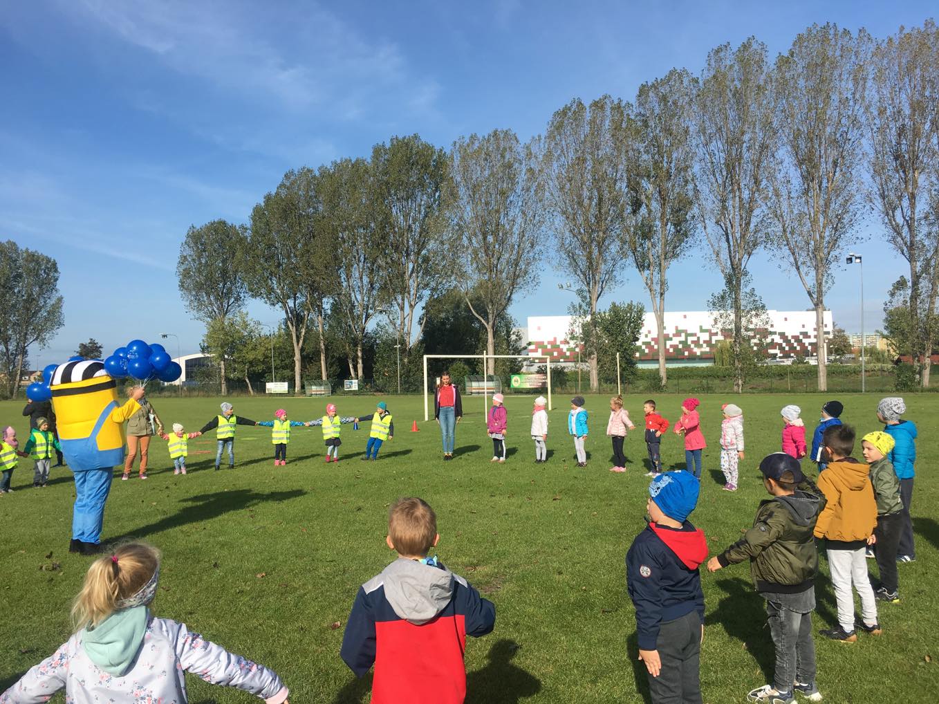 Impreza plenerowa odbyła się na boisku przy Młodzieżowym Domu Kultury w Lubinie, gdzie maluchy dojechały autobusami miejskimi, a starszaki przywędrowały pieszo. Zabawę rozpoczęło uroczyste powitanie przez panią dyrektor i wspólne tańce w kole. Następnie dzieci wzięły udział w zawodach sportowych i bawiły się z użyciem chust animacyjnych.