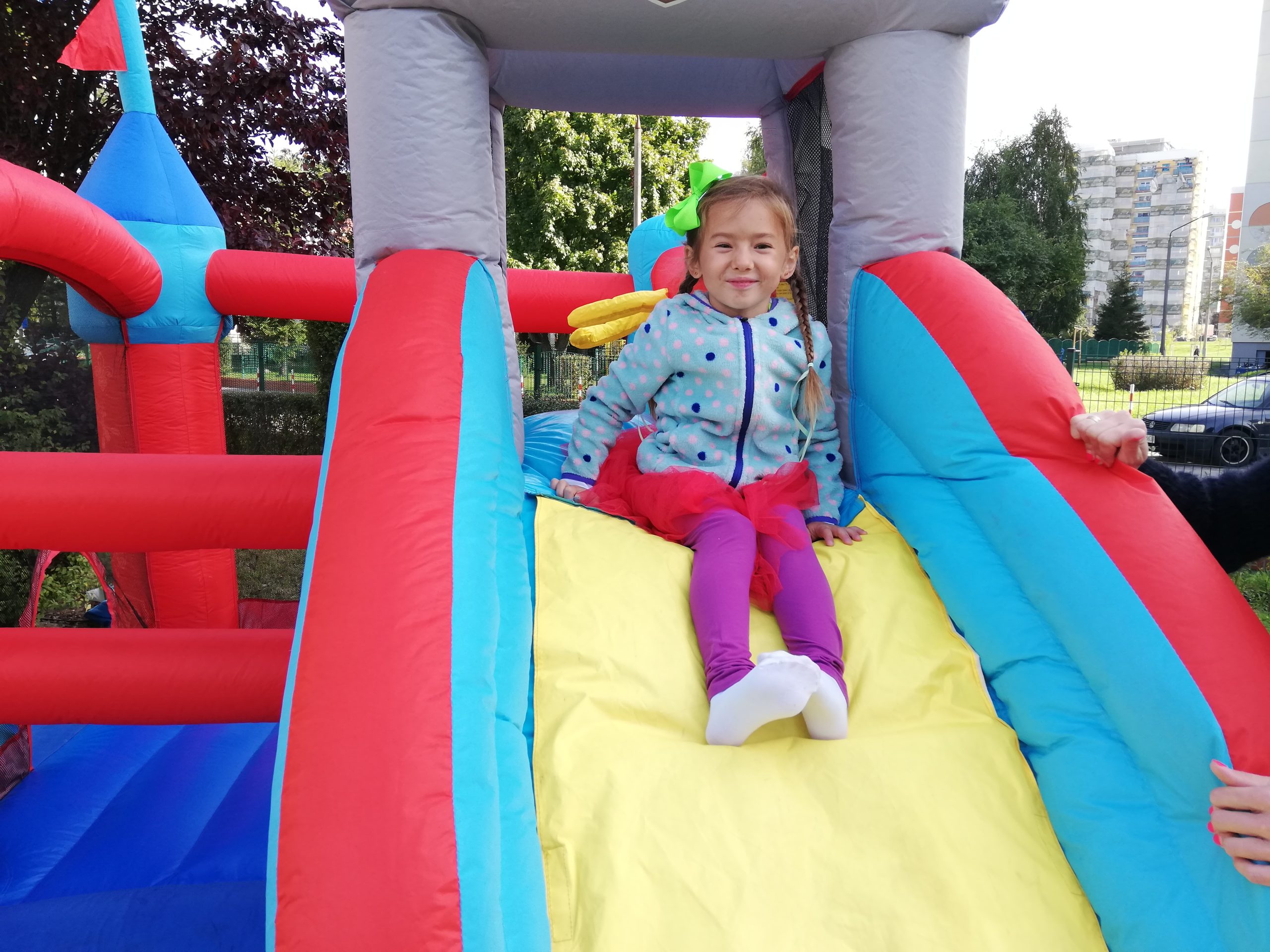 Dodatkową atrakcją dla dzieci był dmuchany zamek rozstawiony w ogrodzie przedszkolnym oraz możliwość wyrażenia swej twórczości artystycznej na foliach i wielkich arkuszach papieru przygotowanych na dworze.