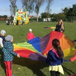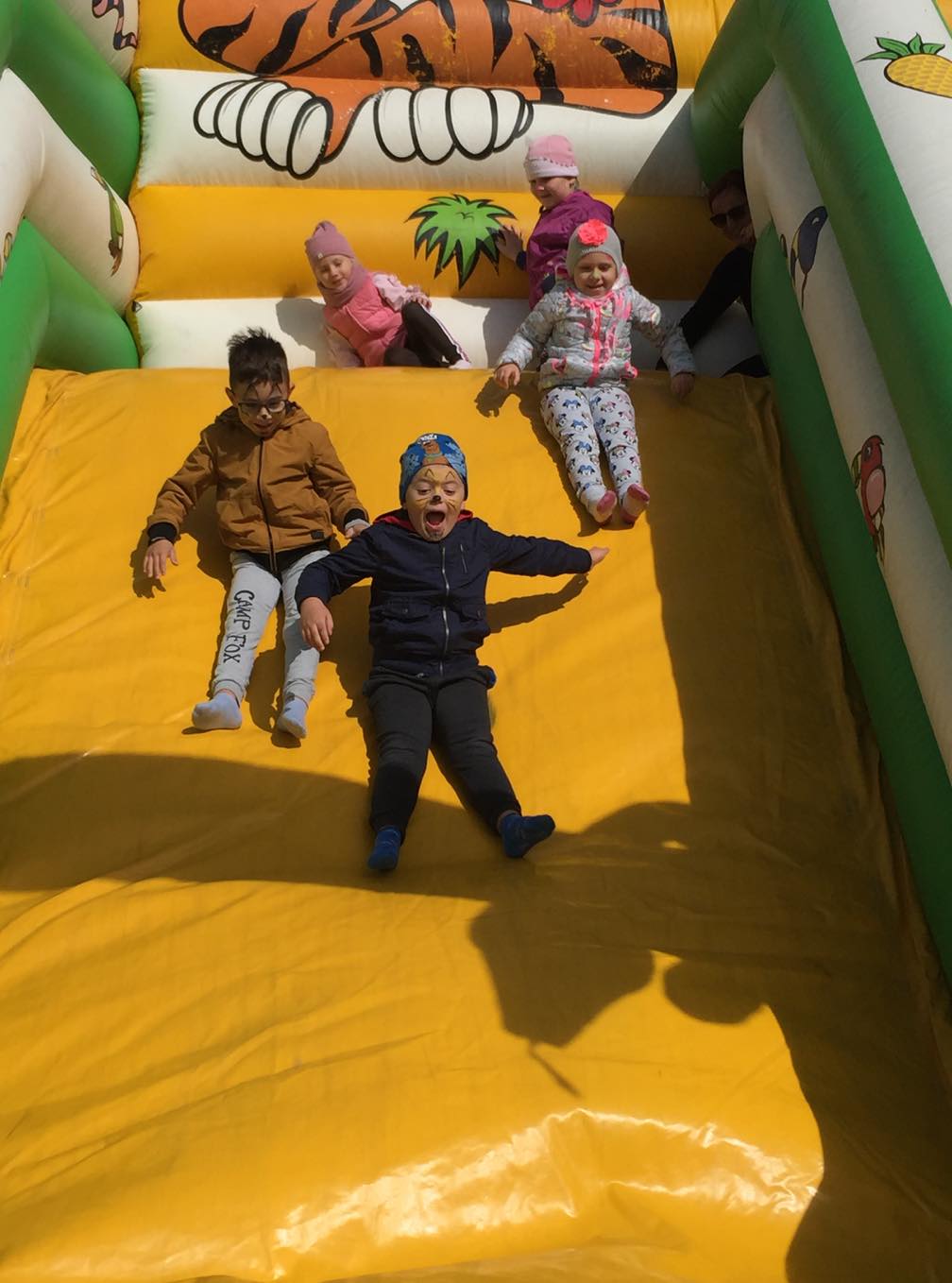 Chętnym maluchom malowano buzie, wyczarowując na nich wymarzone postacie z bajek lub zwierzątka. Dużo radości i uśmiechu przyniosło wspólne puszczanie baniek mydlanych. Zabawa w dmuchanym zamku pozwoliła przedszkolakom wyzwolić prawdziwe pokłady drzemiącej w nich energii.