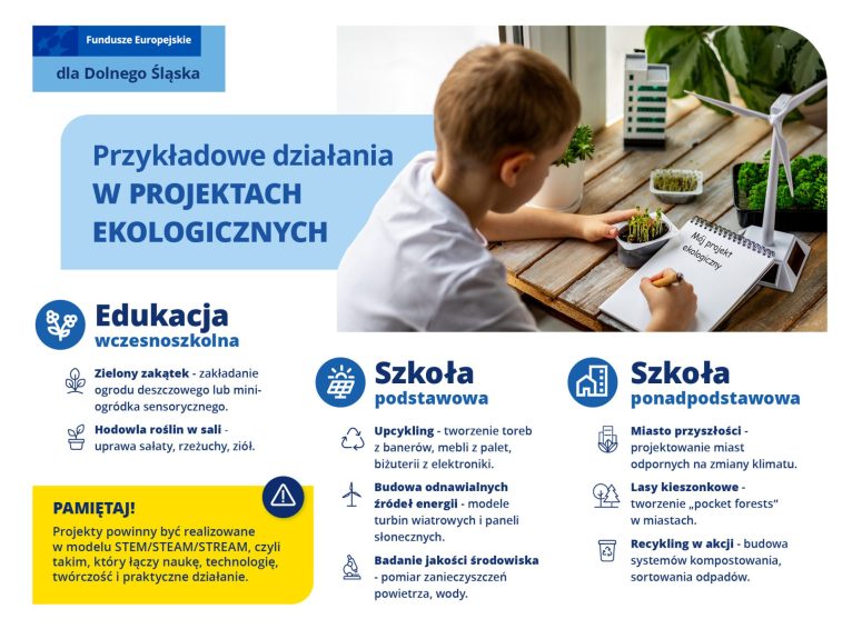 Zmiany klimatu i zanieczyszczenie środowiska to nie są odległe problemy – to wyzwania, które widzimy tu i teraz, w naszym najbliższym otoczeniu. Dlatego warto zacząć od małych kroków, w bliskim sąsiedztwie – w domu, w szkole. Edukacja ekologiczna to nie tylko wiedza, ale także nauka odpowiedzialnych wyborów. Dzięki projektom wspieranym z funduszy europejskich, dzieci i młodzież uczą się, że ich codzienne decyzje mają realny wpływ – czy to przez właściwą segregację odpadów, zakręcenie wody, czy posadzenie drzewa. To inwestycja w przyszłość – w czystszą planetę i w społeczność, która potrafi działać razem.