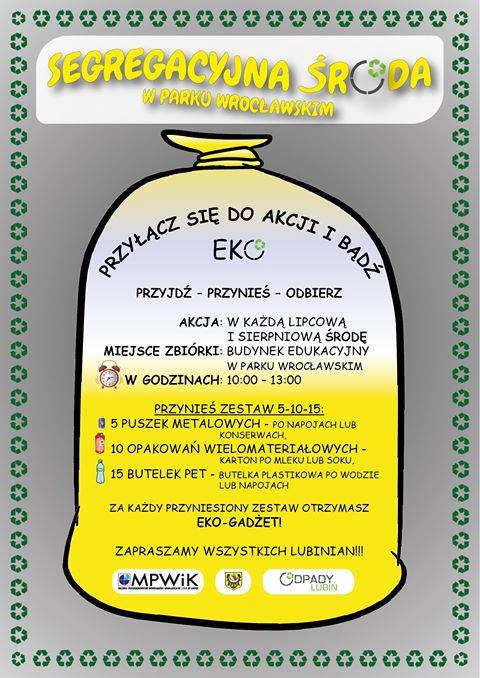 Ponadto każdy, kto przyniesie w środę w godz. 10-13 zestaw: 5 puszek metalowych po napojach lub konserwach, 10 opakowań kartonowych po mleku lub soku i 15 butelek plastikowych po wodzie lub napoju dostanie ekogadżet. Dotyczy to wszystkich lubinian niezależnie od wieku.