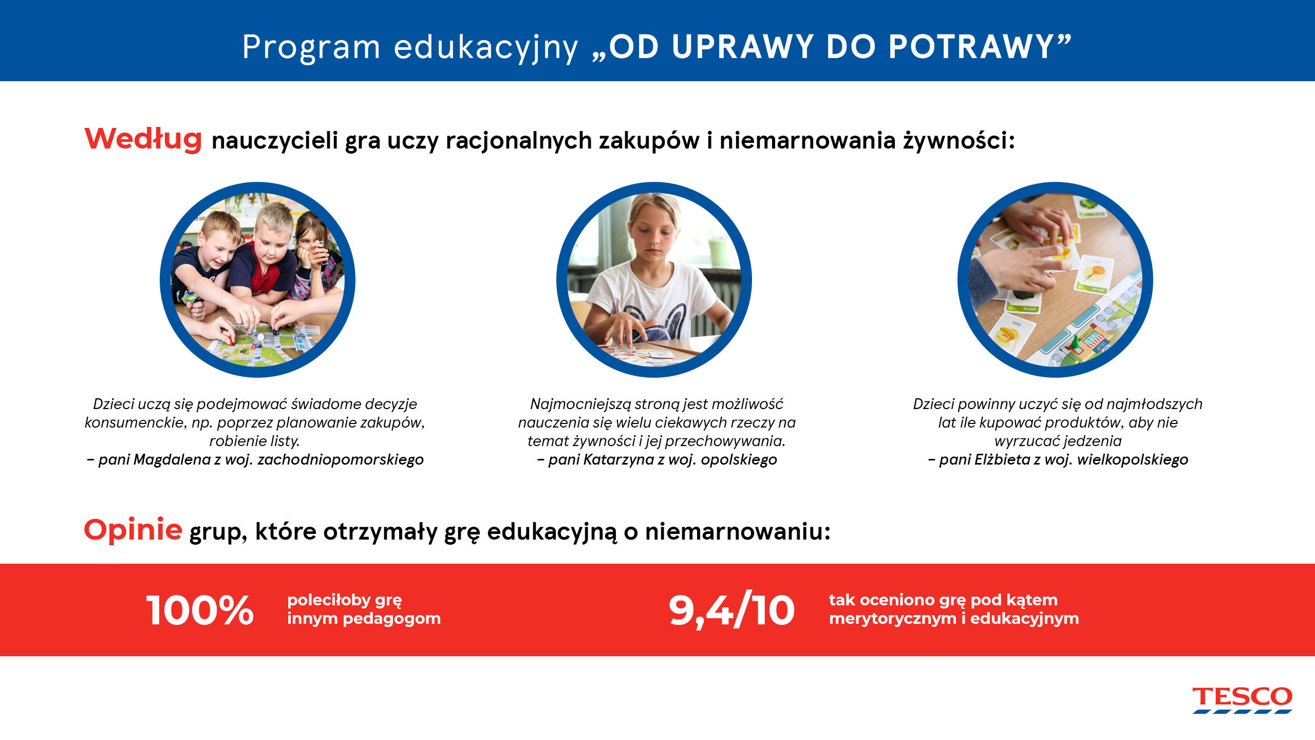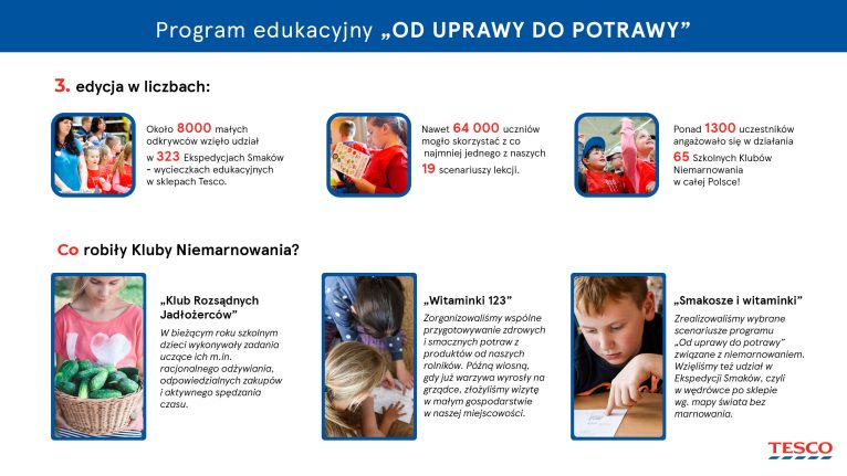 Kolejna edycja programu edukacyjnego „Od uprawy do potrawy” dobiegła końca. Przez 10 miesięcy zrealizowano w całej Polsce ponad 300 wycieczek edukacyjnych, w których wzięło udział około 8 000 małych odkrywców. Ekspedycje Smaków odbywały się również w sklepie Tesco w Lubinie. W ramach programu nauczyciele mogli skorzystać także ze scenariuszy lekcji oraz założyć w szkole Klub Niemarnowania.