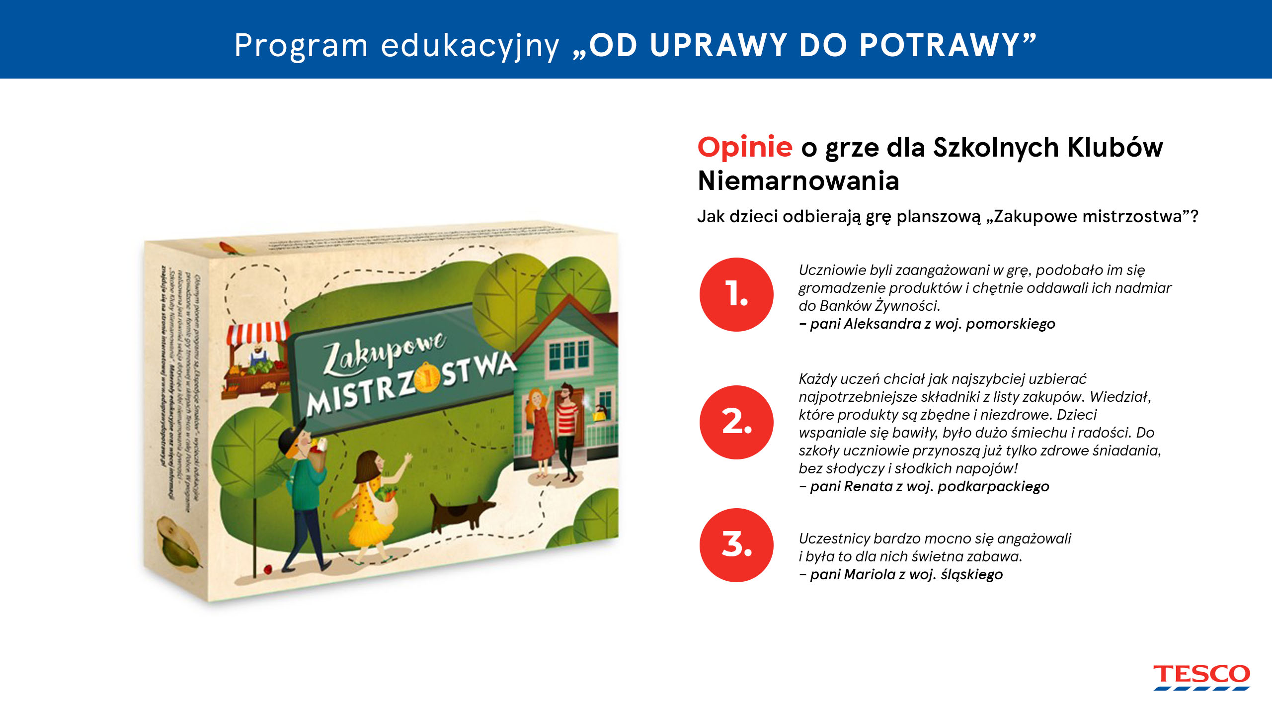 W zaprojektowanej przez Tesco grze uczniowie wcielają się w pomocników kuchennych i zostają wysłani na misję zebrania produktów na obiad. Ich zadaniem jest poruszanie się po planszy i jak najszybsze uzbieranie wszystkich niezbędnych składników przy jak najmniejszej liczbie niepotrzebnych produktów. Jest to idealna gra edukacyjna – ułatwia ona nie tylko zakorzenienie dobrych nawyków zakupowych wśród najmłodszych, ale pokazuje również, że racjonalne żywienie bez marnowania potrafi być zabawą każdego dnia.