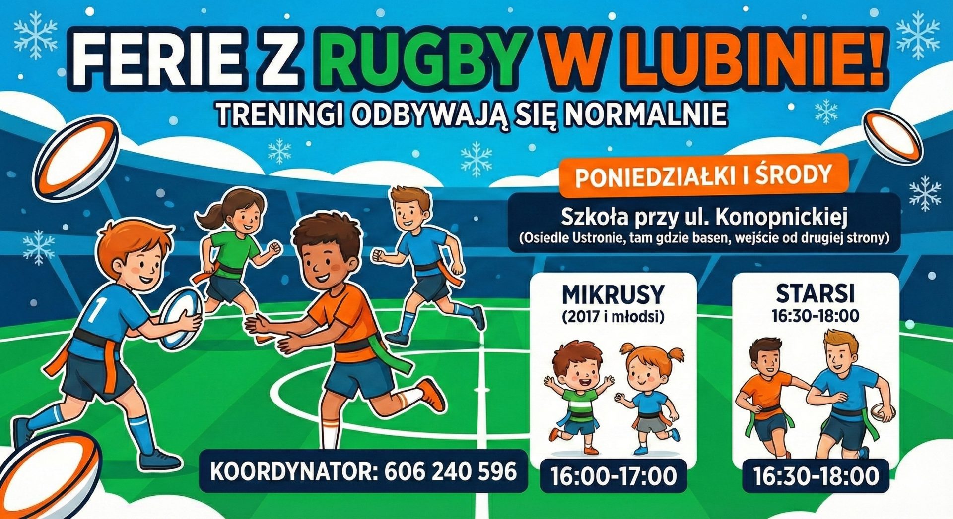 Ci, którzy lubią aktywność sportową, mogą też skorzystać z propozycji Klubu Rugby Miedziowi Lubin, który zaprasza dzieci i młodzież na zajęcia sportowe w czasie ferii.