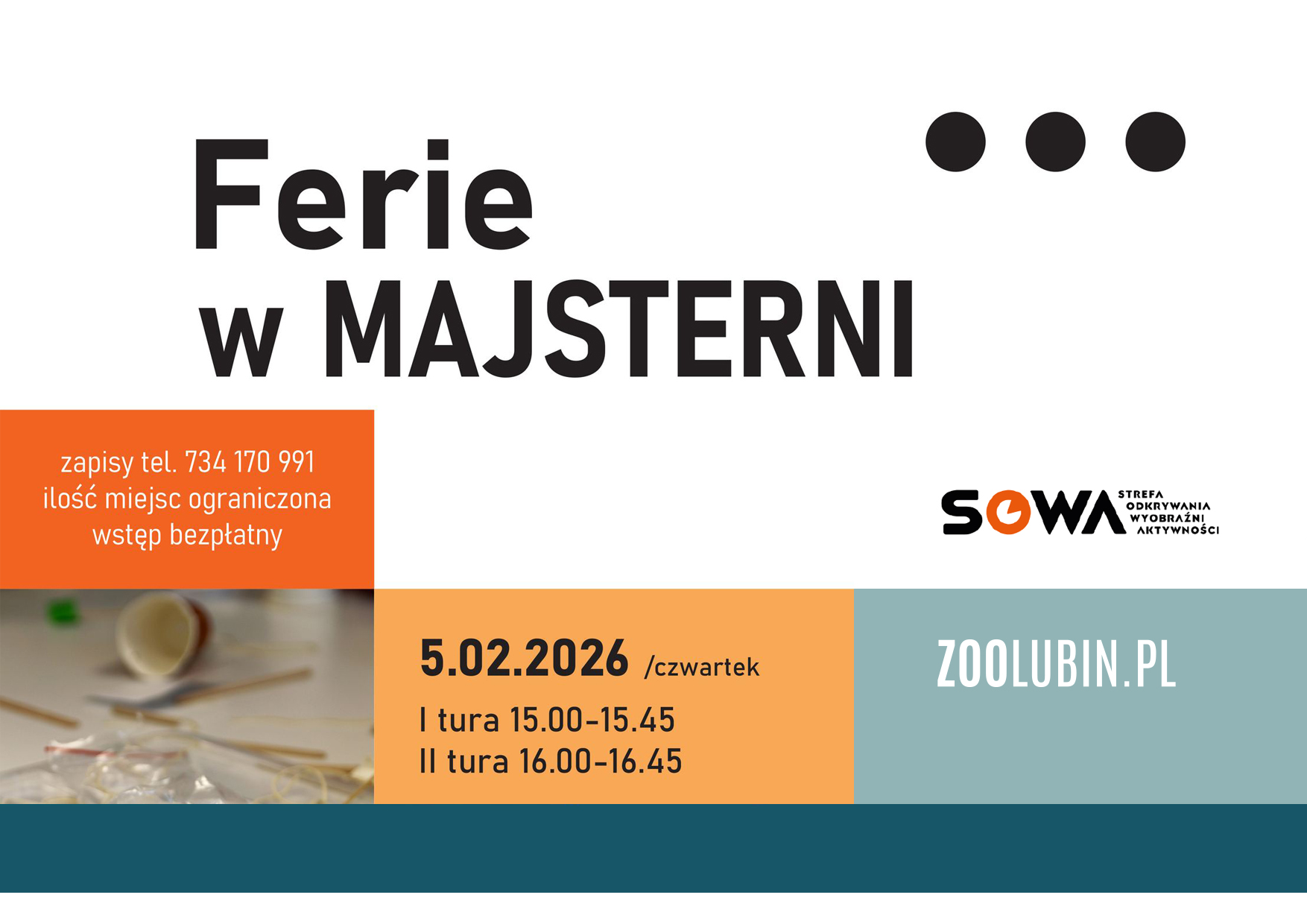 Ponadto w oba feryjne czwartki – 5 i 12 lutego – w godzinach 15-15.45 oraz 16-16.45 zoo zaprasza do jeszcze mało odkrytej części Strefy SOWA – Majsterni. Udział jest bezpłatny, ale obowiązują zapisy pod numerem telefonu 534 439 337.