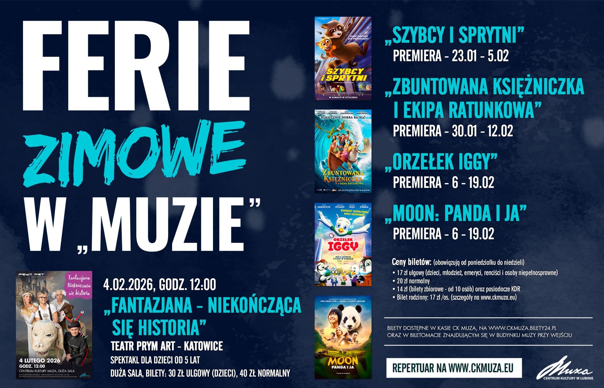 Ponadto Muza zaprasza dzieci w ferie na spektakl teatralny „Fantazjana – Niekończąca się historia” w wykonaniu Teatru Prym Art z Katowic. Odbędzie się on 4 lutego o godz. 12. Bilety kosztują 30 i 40 zł.