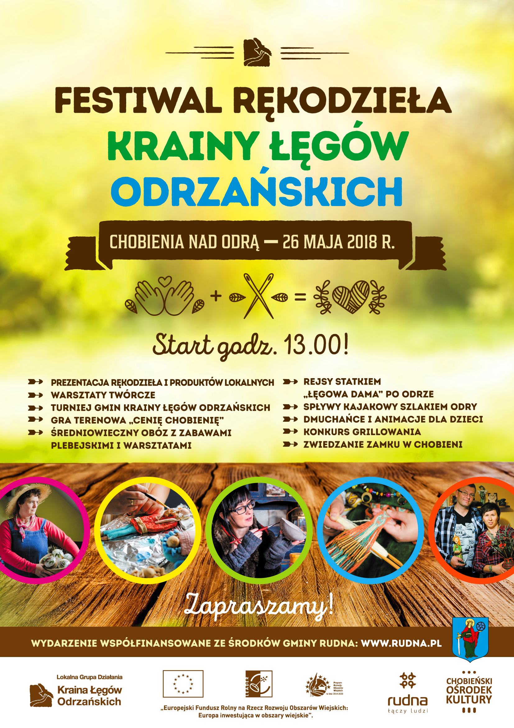 Główną osią Festiwalu będzie prezentacja lokalnych rzemieślników, rękodzielników i producentów lokalnych. Wyroby z drewna, ceramiki, ręcznie malowane torby czy poduchy, autorskie lalki i ubrania, zdrowe soki, przetwory to tylko przykłady tego, co będzie można kupić i podziwiać na Festiwalu. Rękodzielnicy staną za stoiskami, poprowadzą warsztaty w duchu „zrób to sam”i podzielą się swoimi pasjami. Będzie można zatem popracować w glinie, drewnie, z materiałem, farbami. Każdy znajdzie coś dla siebie,każdy uczestnik będzie mógł zabrać swoje dzieło ze sobą. Dodatkową atrakcją będzie warsztat kulinarny, a także konkurs grillowania. Festiwal uatrakcyjni również wioska słowiańska z udziałem Dziadoszani Pobratymców, a w samej wiosce między innym: strzelanie ze średniowiecznego łuku, nauka tańca średniowiecznego, pokaz i warsztat rzemiosła średniowiecznego, zabaw plebejskie oraz gry edukacyjne i plenerowe. Podczas festiwalu odbędzie tradycji Turnieju Gmin KŁO, który tym razem zostanie rozegrany w formie gry terenowej po Chobieni.
