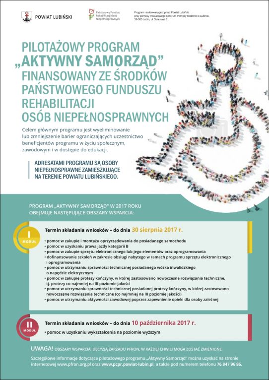 Szczegółowe informacje dotyczące pilotażowego programu „Aktywny Samorząd” można uzyskać na stronie internetowej www.pfron.org.pl oraz www.pcpr.powiat-lubin.pl, a także pod numerem telefonu 76 847 96 86. Program realizowany jest przez powiat lubiński przy pomocy Powiatowego Centrum Pomocy Rodzinie w Lubinie, 59-300 Lubin, ul. Składowa 3.